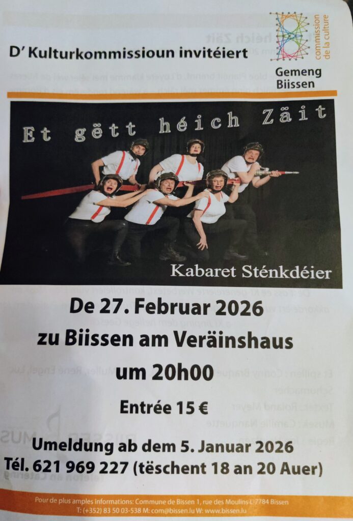 Posted on 06/01/2026 by René Engel Kulturkommissioun vun Bissen huet lo offiziell den Datum vum 27. Februar lancéiert: Post navigationPrevious post: An den 31.01 sin mir fir Iech zu Suessem, am Artikuss.